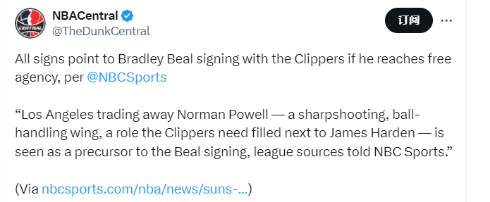 联盟消息人士告诉NBC体育,快船队交易走诺曼-鲍威尔——一位擅长远投和控球的侧翼球员,而这正是快船队在哈登身边所需要的角色——被视为签约比尔的前奏。虽然比尔可以顶替邓恩进入快船队的后场首发,但从防守角度来看,更好的安排是让比尔带领第二阵容出场,其中包括约翰-科林斯(除非科林斯首发,小德里克-琼斯替补出场)、博格丹-博格达诺维奇和布鲁克-洛佩斯。快船队可以为比尔提供他们剩余的中产特例(估计约为530万美元)或薪金空间特例(510万美元)。